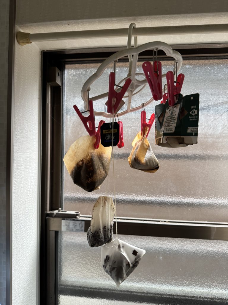 こちらはメンバー伊藤さんが取り組むティーバッグなどの乾燥です。まさに干すことで乾燥させていますね。