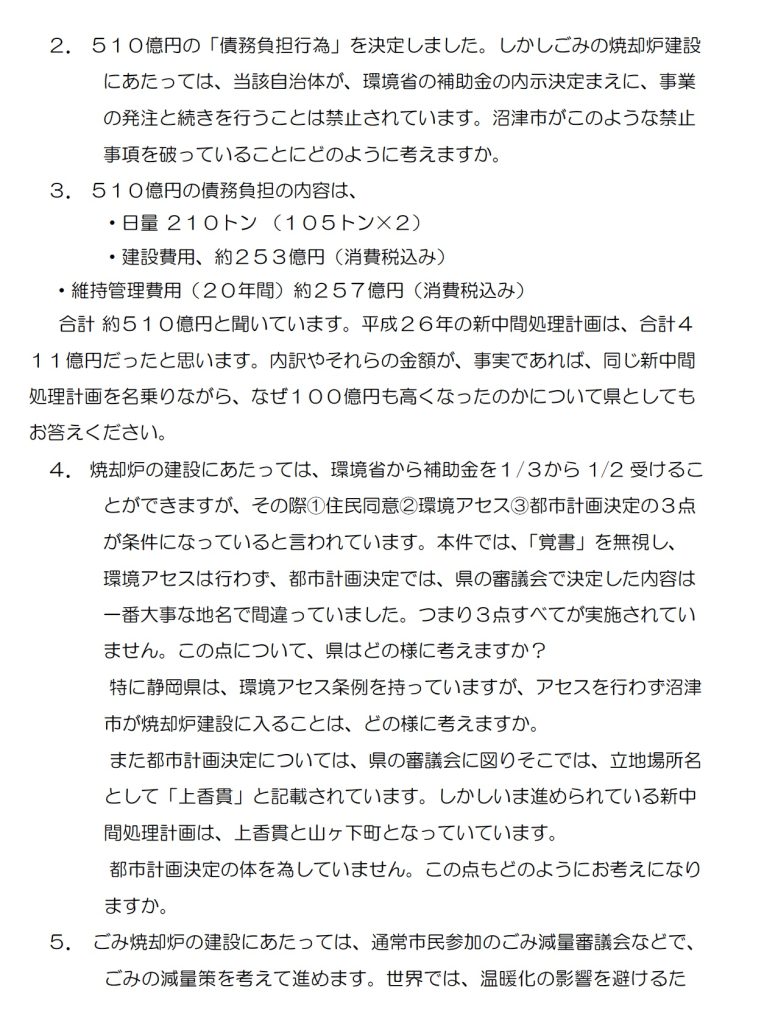 沼津市の計画の問題を指摘し正すべきとして静岡県知事への質問状