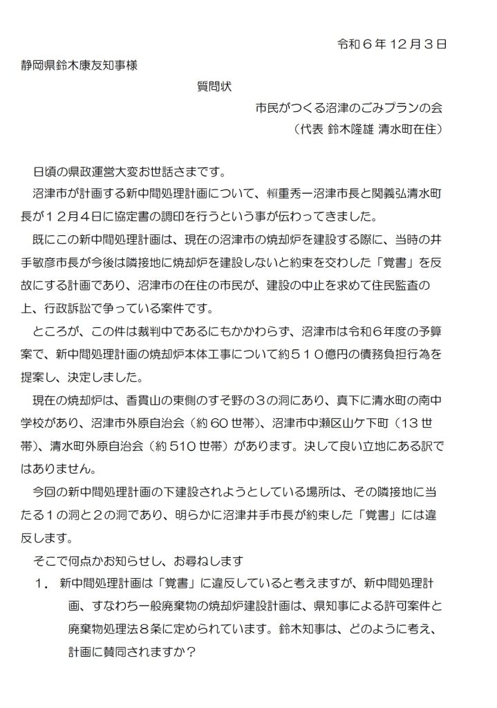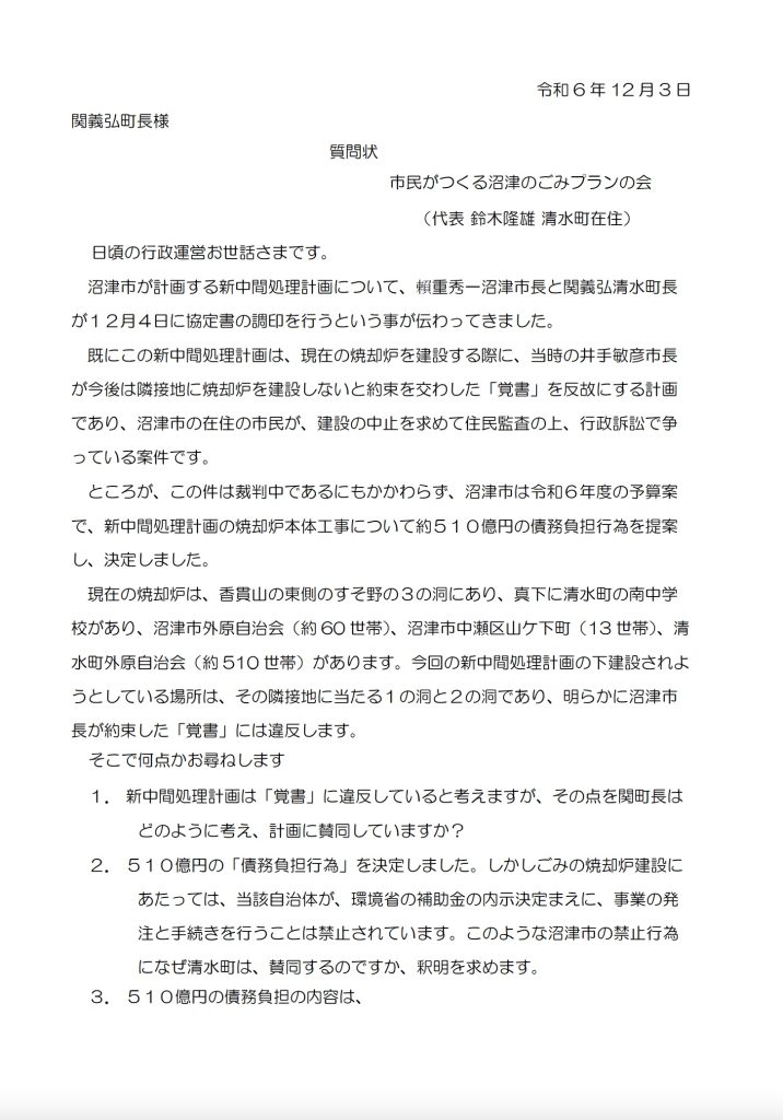 市民の声を聞かず強引に計画を推し進める沼津市長と地元住民の生活・生命を守ることを放棄し沼津市に付随するかのような町政運営を続ける清水町長。そしてそれらを正さず補助金をおろしつづける静岡県知事に対して多くの問題についてどのように考えているのか。2024年12月3日質問状を提出しました