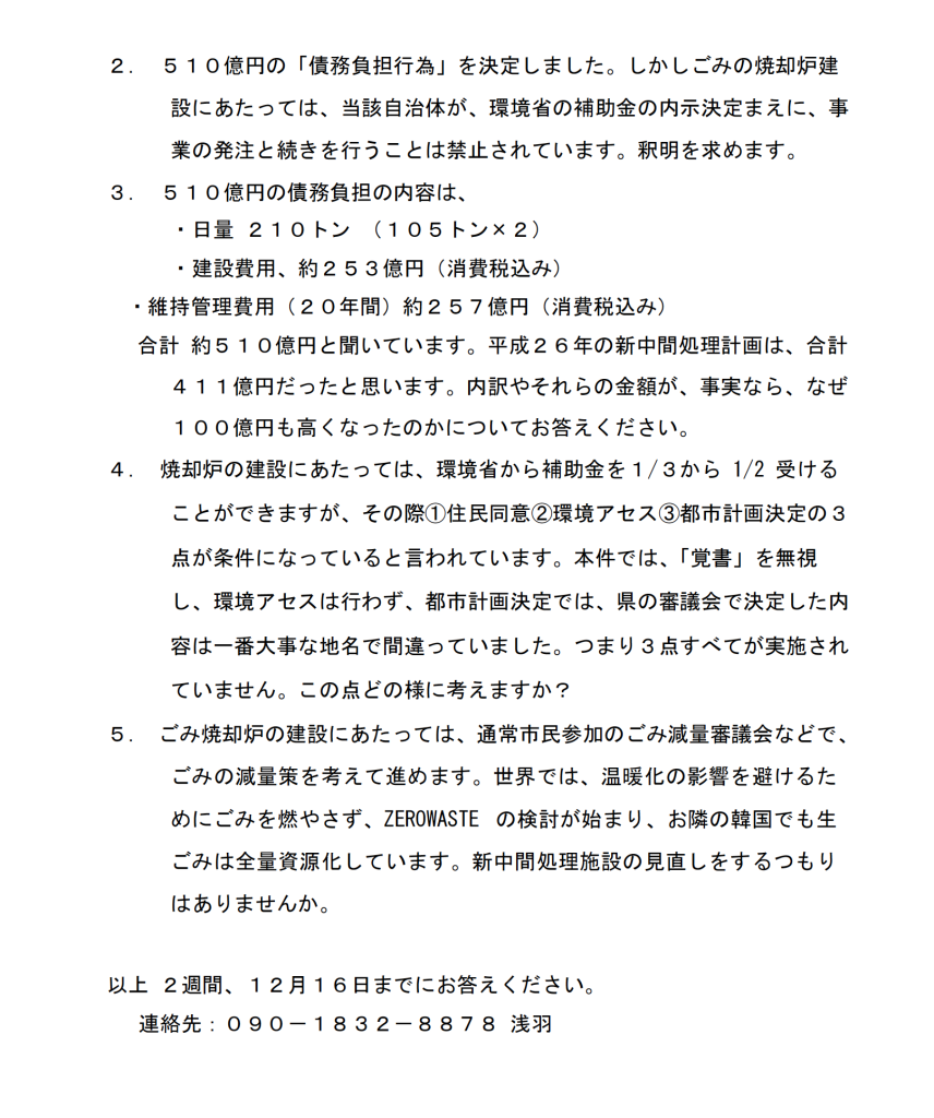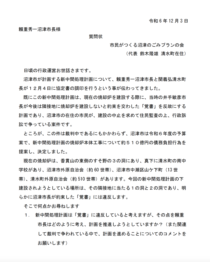 シンごみ処理場について計画を立て実施している地方自治体ある沼津市に対しての質問状