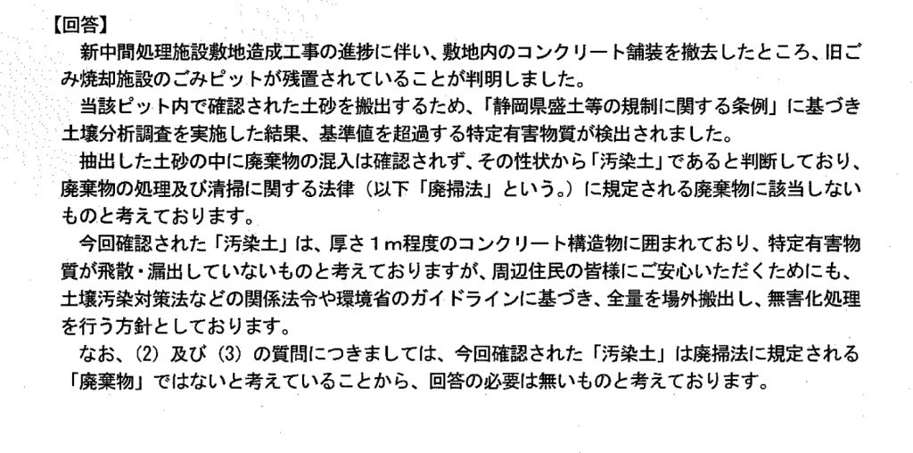 この猛毒であるダイオキシンを含む汚染土壌が発見された状況や対応についてごみプランの会は質問状を提出しましたので、沼津市の回答から引用して状況を説明します。