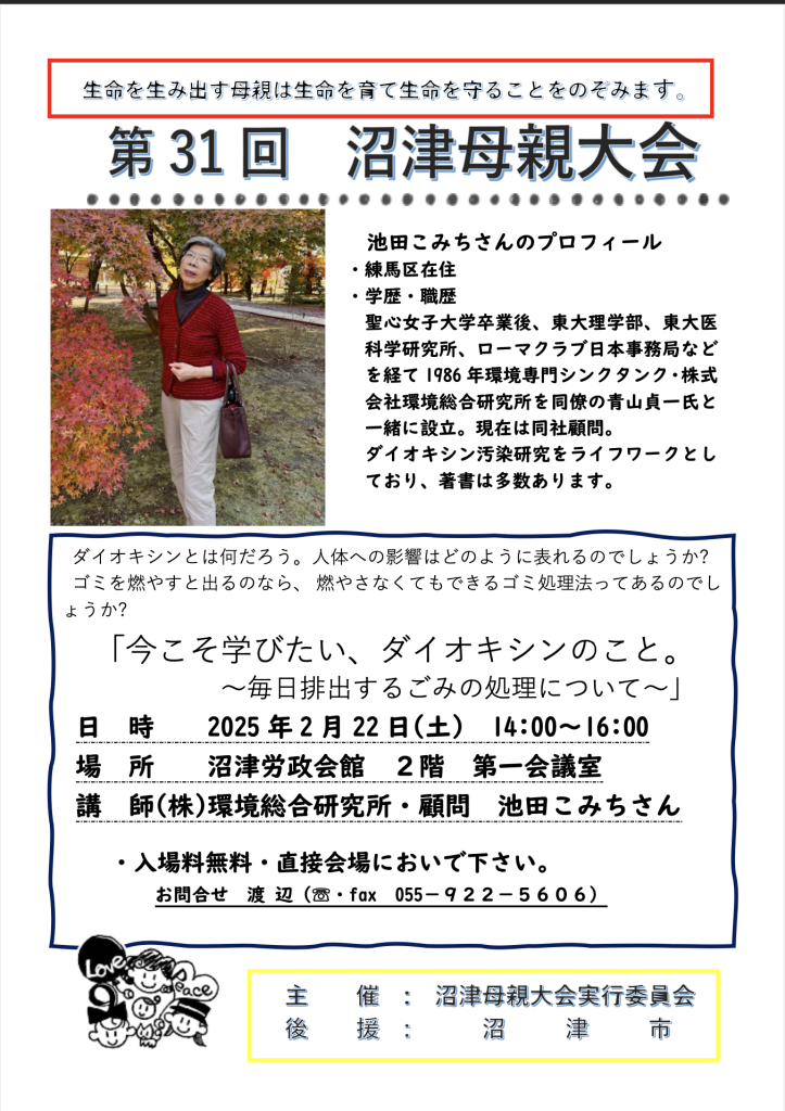 ダイオキシンの危険性についてはたくさんの書物がありますが2月22日土曜日午後2時から午後4時沼津労政会館2階第1会議室で、日本国内ではダイオキシンへの取り組みで著名な活動をされている環境研究所顧問の池田こみちさんの講演会が行われます。