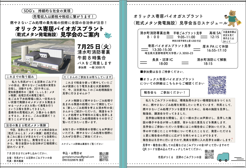 私たちごみプランの会は7月25日火曜日にオリックス寄居にある寄居バイオガスプラント(乾式メタン発酵施設)への見学会を予定しています。